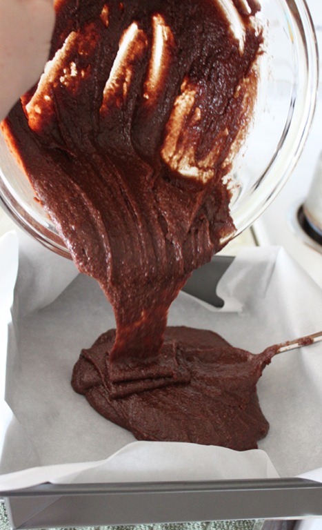 Try not to overmix your batter, it will just tighten up on you and this is already thick enough as is. When your ingredients are combined, pour the batter into an 8 or 9 inch cake pan lined with parchment paper. Let it hang out for a minute while you make your cheesecake topping.