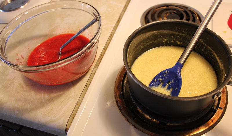 Next, prepare your ice cream base. Bring milk and sugar to a boil, reduce the heat and then temper in your eggs, add in your strawberry puree, and simmer over medium heat until you get a custard-like consistency.