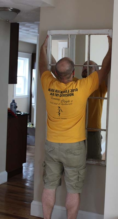 We were a little bit worried about hanging such a large and heavy piece but John found the studs, got some excellent frame wire, and it went up like a dream. It really enlarges the hallway, creates even more light, is decorative/looks like art, and serves as a full length mirror. Win!