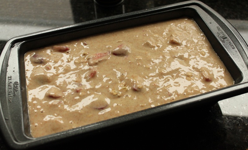 Bake the bread in a greased loaf pan for 50-60 minutes, rotating once halfway through.