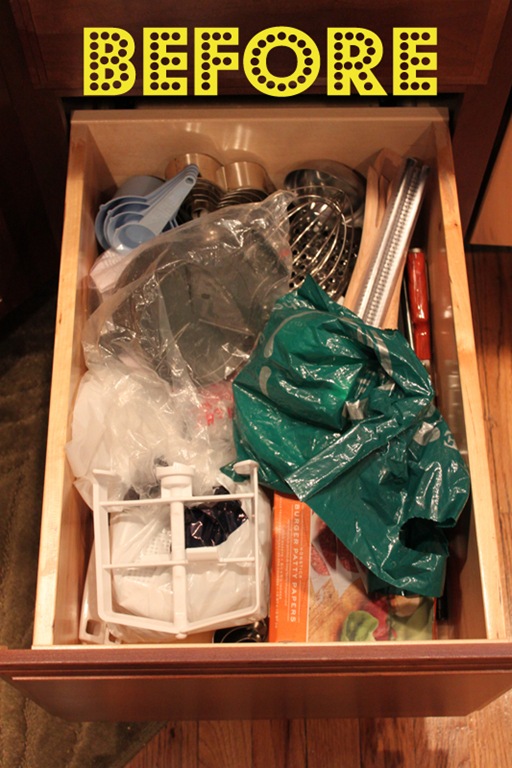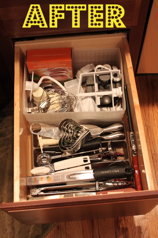 When I unpacked all of our kitchen boxes I kind of just tossed all of our miscellaneous utensils in a drawer together. This weekend I finally had some time to organize it (as much as possible). It’s still a little crazy in there but now it’s more like Organized Chaos instead of WTF Happened In Here. You know?