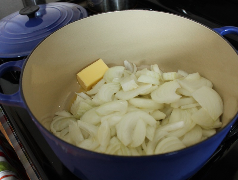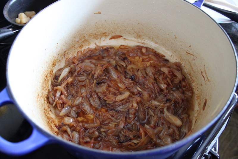 I started by caramelizing 3 onions in my favorite kitchen item – my cast iron Le Creuset dutch oven. This took about 30 minutes.