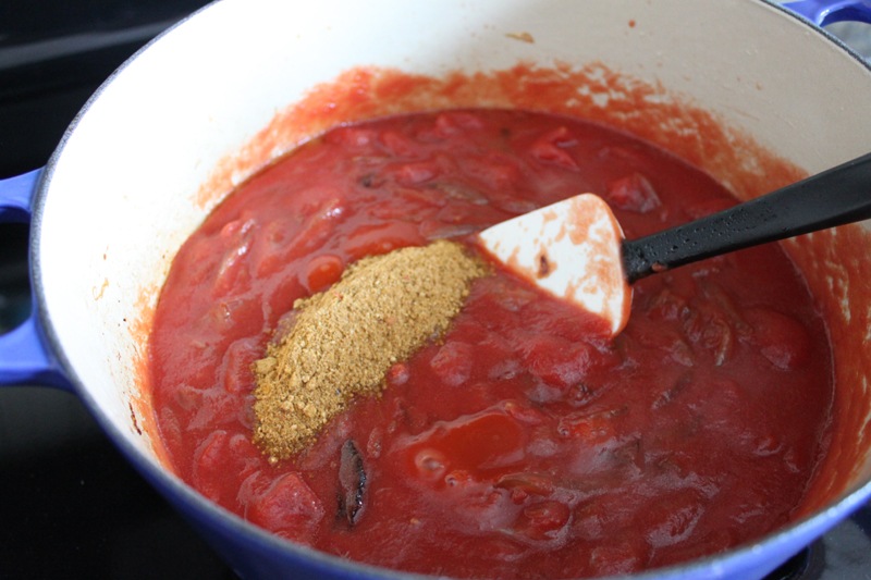 Into the same pot I added the tomato sauce and crushed tomatoes, and stirred to combine. I then added my spice mixture, stirred, and brought the whole thing to a boil over high heat.