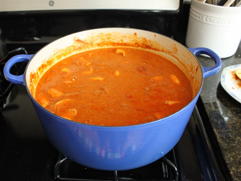 After an hour I added all the chicken, stirred thoroughly, and simmered on low-medium heat with the cover on for an hour and a half.