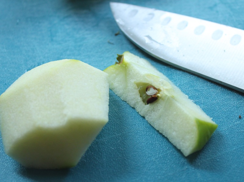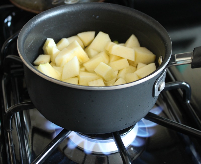 Get your applesauce going: heat half of your apples, one pinch of cinnamon, and about a half cup of water over high heat. Boil together until the water is absorbed/the apples are mushy.