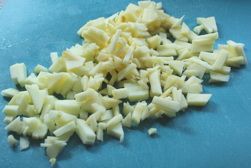 Start by peeling, coring, and cubing your apples. Reserve half for applesauce and the other half to put in the batter.