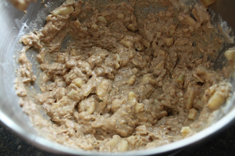 Add in your applesauce (make sure it has cooled down a bit before tossing it in here) and mix.