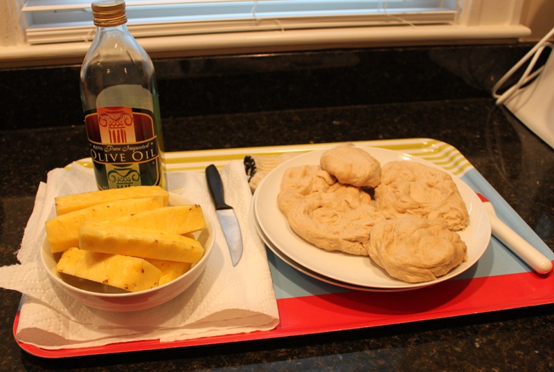 We oiled up the pineapple with EVOO and used our smaller “test” pieces of dough to start.