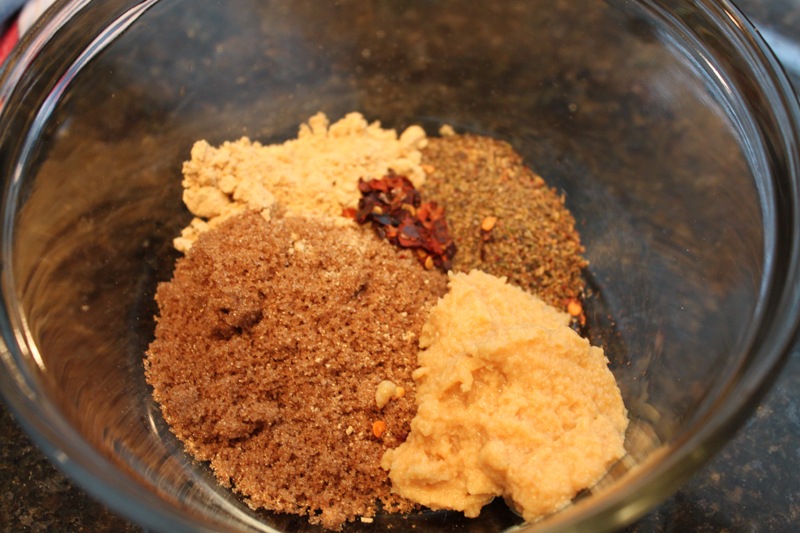Mix your spices, garlic, and sugar together in a bowl. Add soy sauce and water, set aside.
