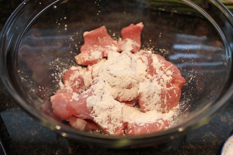 Cut/cube your pork, toss in the cornstarch. A little bit of excess is ok, it will thicken your sauce later.