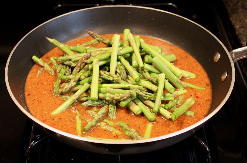 Start by heating your sauce and asparagus over medium-high heat. Bring it to a boil and cook until the asparagus is tender. Set aside in a small bowl. You could also saute your asparagus to brown it then add the sauce, I’ve done that too and it’s delicious.