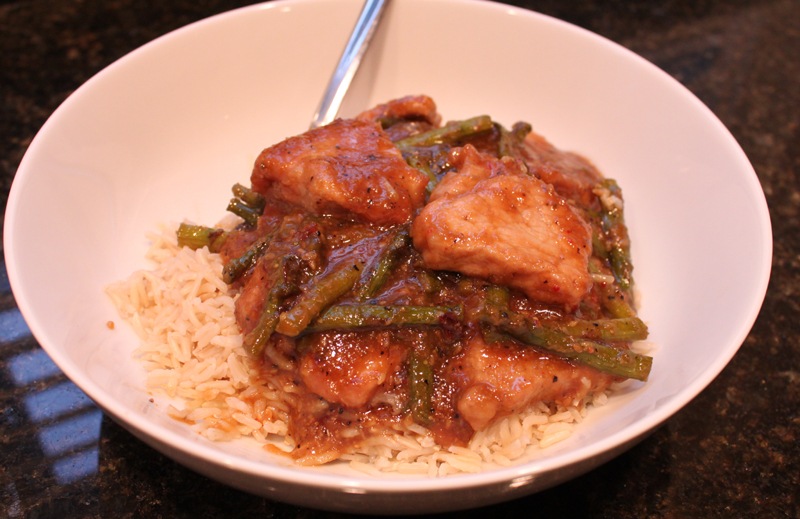 When your pork is browned to your liking, add your sauce and asparagus back in. Let it cook together for another 5-10 minutes over medium heat or until the pork is cooked through and the sauce thickens up.
