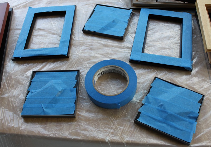 Before painting I brought all of the frames out to the back porch, laid out a drop cloth (which felt reminiscent of a Dexter kill scene), and taped all of the frames that I needed to be extra careful painting.