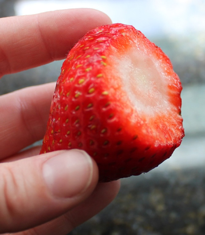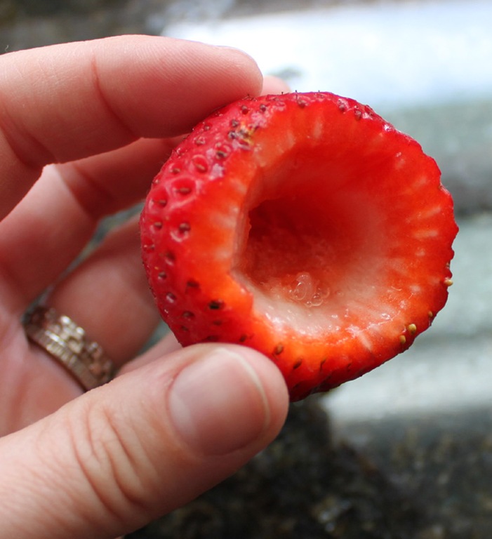 Once all of the strawberries are washed and trimmed, hollow out the core. I slid a small paring knife into the white membrane in the top and followed the center line of the core in a circle and on an angle. Super easy, the core popped right out.