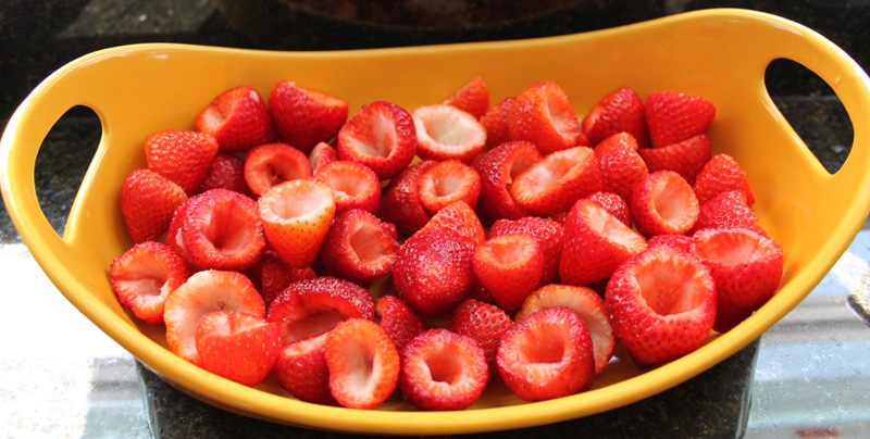 Place your prepped strawberries in a dish to await stuffing.