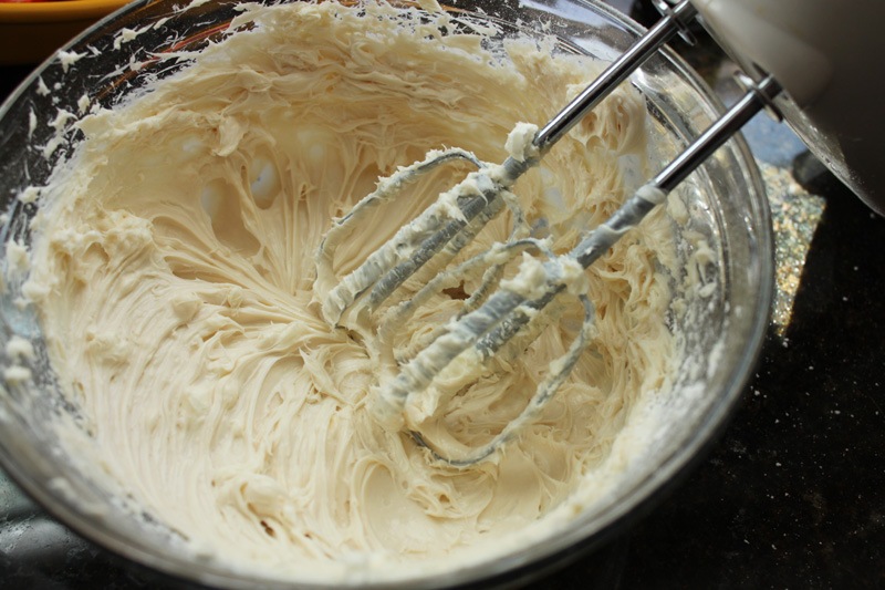 For the filling: beat your cream cheese, vanilla, and sugar together with a hand mixer until everything comes together smoothly. Fill a piping bag or ziploc bag (what I did) with the filling. Make sure the hole at the bottom is big enough or you’ll explode the bag when you squeeze.