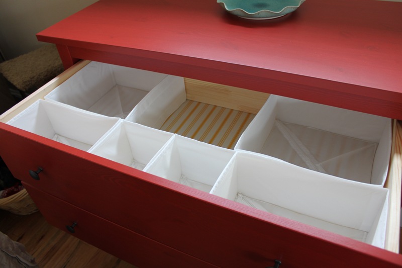 It has three drawers that are pre-lined with the cutest yellow striped interior. We also bought these great drawer dividers for smaller items.