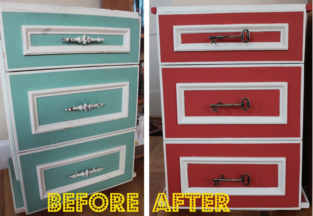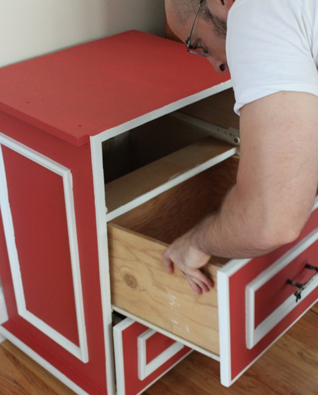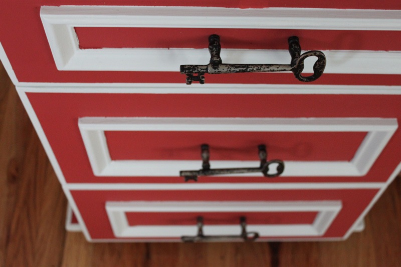 I then painted all of the drawers: coral on the first two and white on the last one.