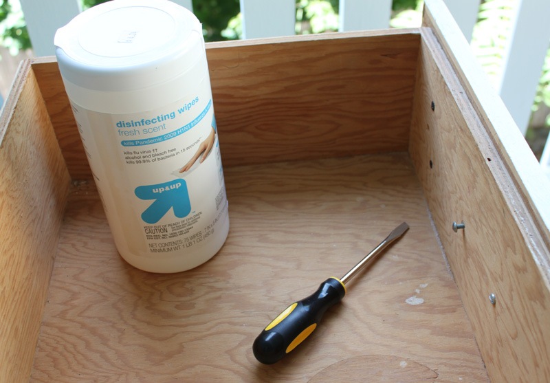 The hardware was easy enough to take off. I then wiped down the entire interior with some disinfecting cloths from Target. I let everything dry for about 30 minutes.