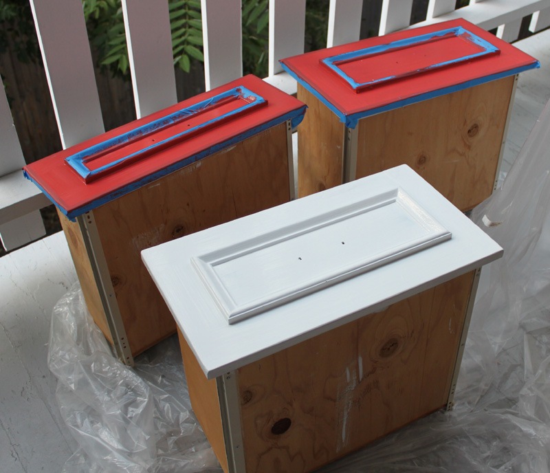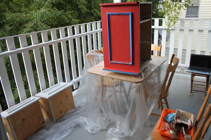 I taped the remaining white drawer and gave everything a coat of coral paint.
