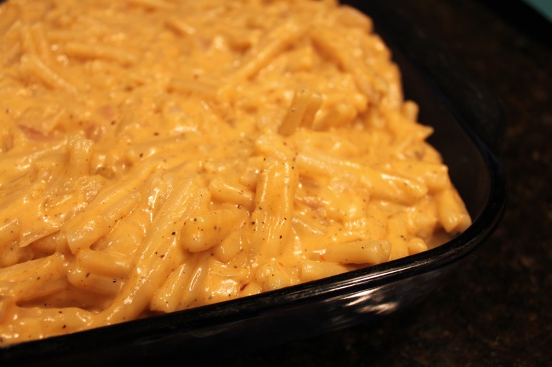 Toss your cooked pasta into your cheese sauce and stir thoroughly. You want an even distribution of cheese on each piece of pasta.
