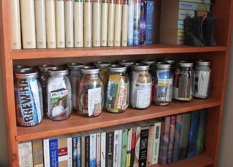 Unintentionally I found the greatest solution. As they always do, Young House Love provided genius inspiration for what to do with all of my travel treasures: Vacation Jars! Basically you put all of your keepsakes into a jar to put on display instead of having all of your treasures sit in a box unseen.