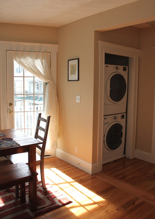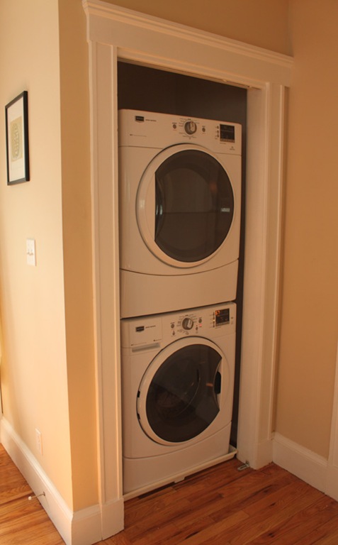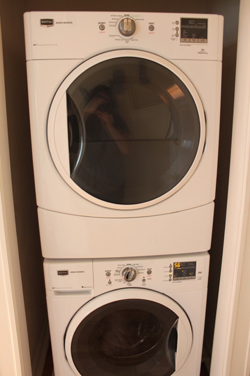 Three weeks later (yup, the backlog after tax free weekend was huge, who knew?) delivery day came – new, shiny, yay! Our hopes were dashed when the GE guys told us the whole set was too big to fit in our laundry closet (the pre-designated space in the condo outfitted with all the water/electric hookups). It measured fine in the store however the stacking kit that attached the two machines together added like 3 inches. Frick. We had to refuse the delivery, go back to Home Depot, and exchange it for a smaller model. We ended up with a tinier, but just as nice, Maytag washer and dryer.