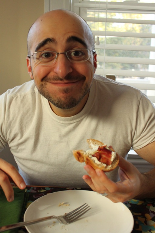 You can add a whole mess of other finishing touches as well. Here I added a little bowl of honey, some hot crispy bacon, black sesame seeds on top of the goat cheese, and baked a whole loaf of sourdough bread for spreading and piling.