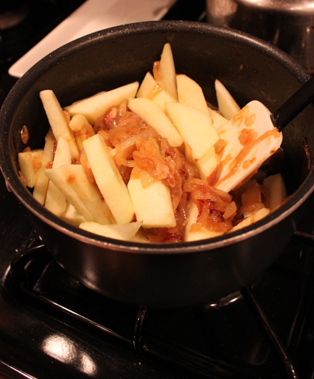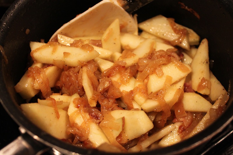 When the onions and bacon are done cooking turn the heat off completely but leave everything in the pot on the stove. Toss the apples into the pot and stir to thoroughly combine everything. At this point you’ll want to season your filling with salt and pepper.