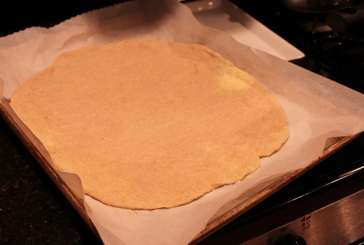 When your dough has fully risen (it should have doubled in size, see below) roll it out flat on a parchment paper lined baking sheet.