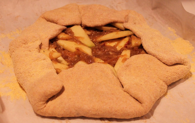 Pile your filling on to the middle of the dough and spread outward. Pull the remaining dough up and over the edges to cover half of the filling, creating a rustic tart look.