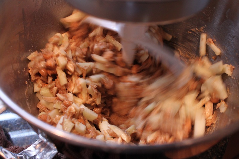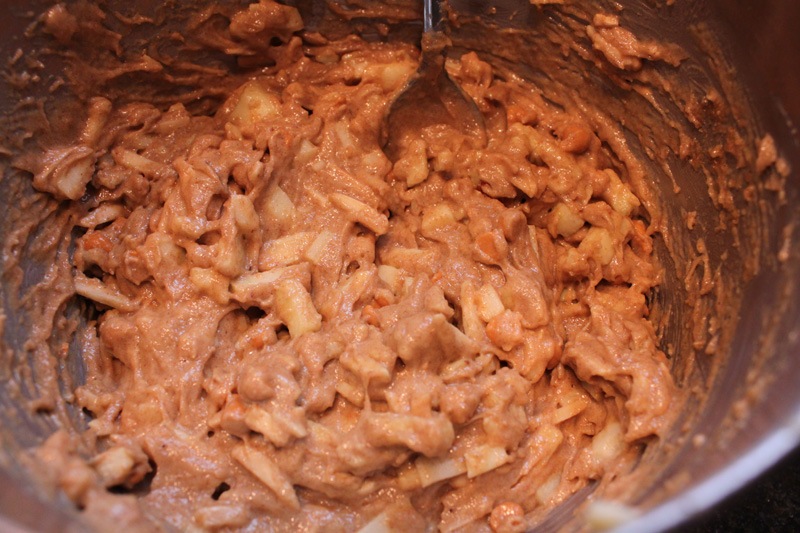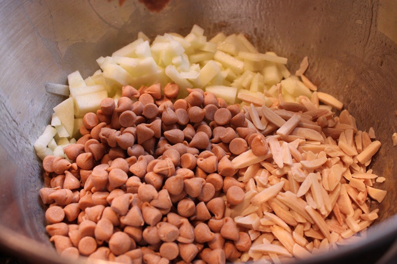 Toss the apples, butterscotch chips, and almonds into the batter…