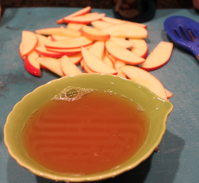 When you’re ready to make the sangria begin by cutting up your apples and limes. I like a thin slice on both. Use the ends of the limes to squeeze into the sangria.