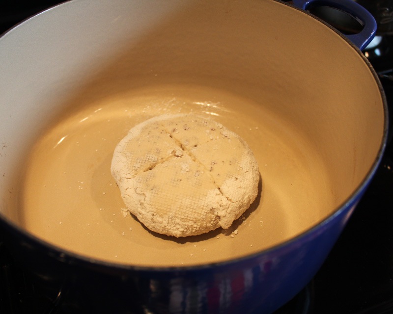 First, preheat your oven to 450 degrees with a cast iron skillet and baking vessel inside. Once the oven was preheated, I placed my bread dough in the middle of my Le Creuset and scored the top with a sharp knife. I then poured a cup or two of water into the hot cast iron pan and closed the oven door quickly. This allows the dough to be fully surrounded by steam. After three minutes in the steamy stove, I put the lid on the Le Creuset and baked the bread like that for about 15 minutes. This ensures that all of the steam inside the dough will be trapped there while the bread actually bakes.