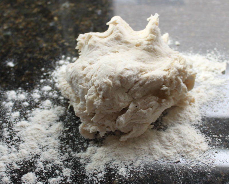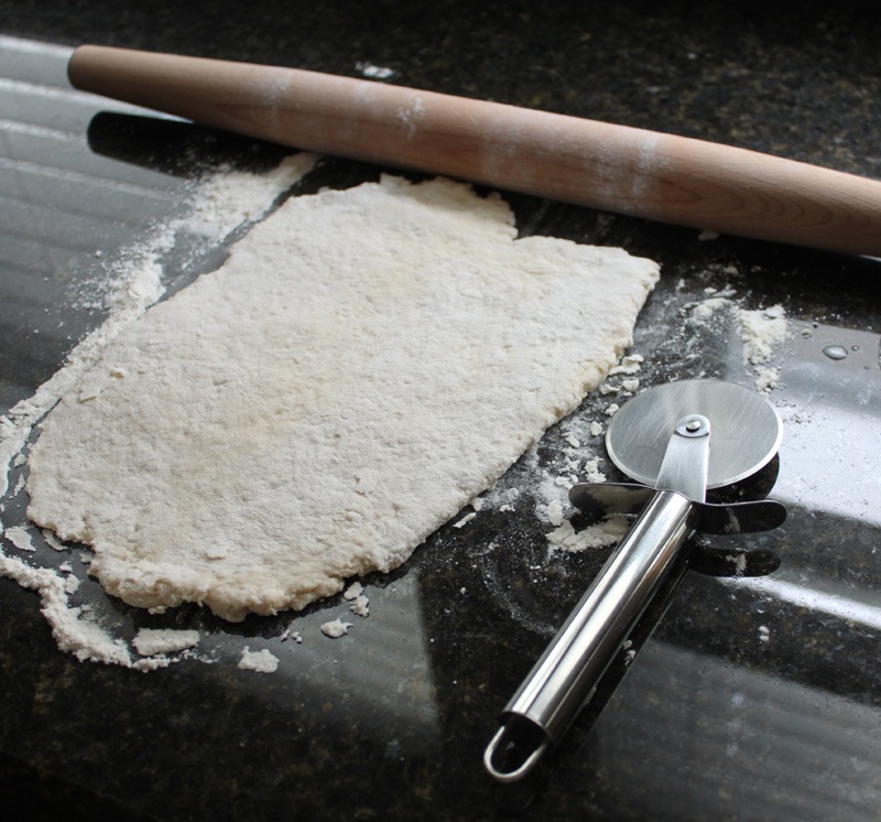 After the dough came together I turned it out on to a floured surface, rolled it out to about 1/2” thick, and cut into 2” squares.