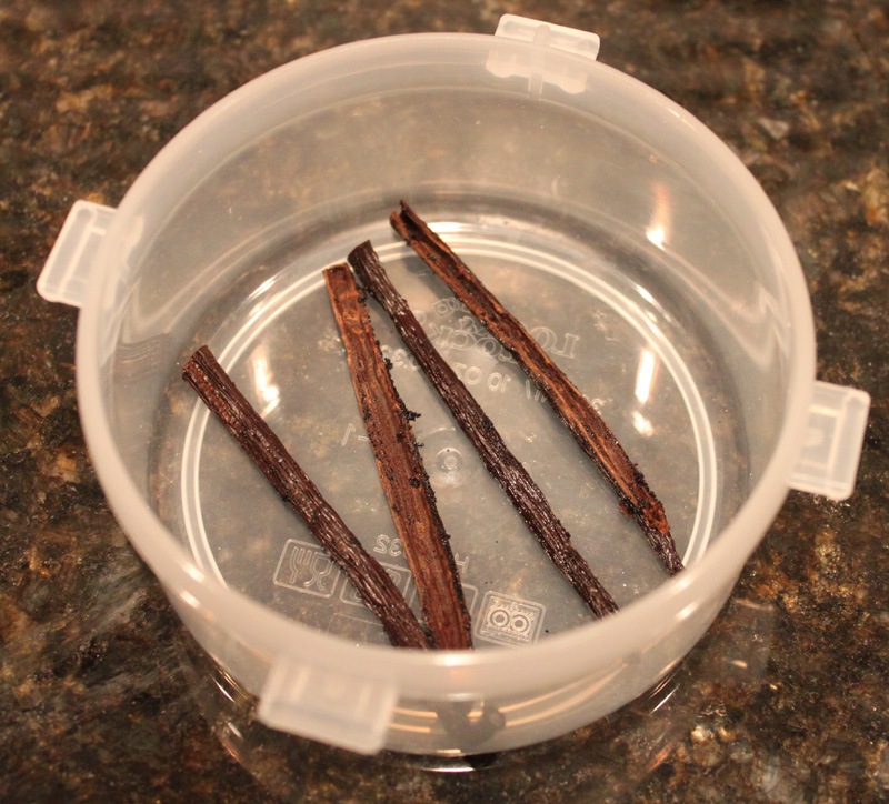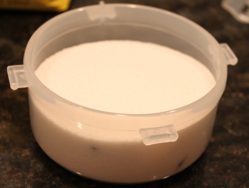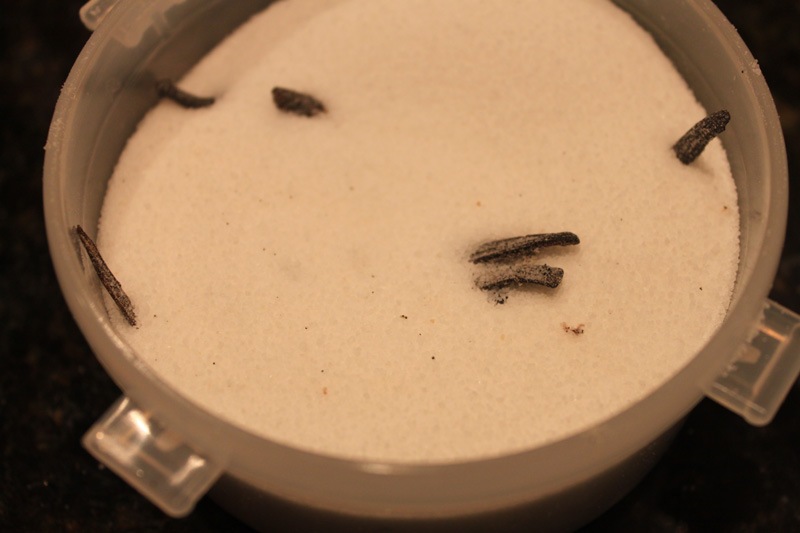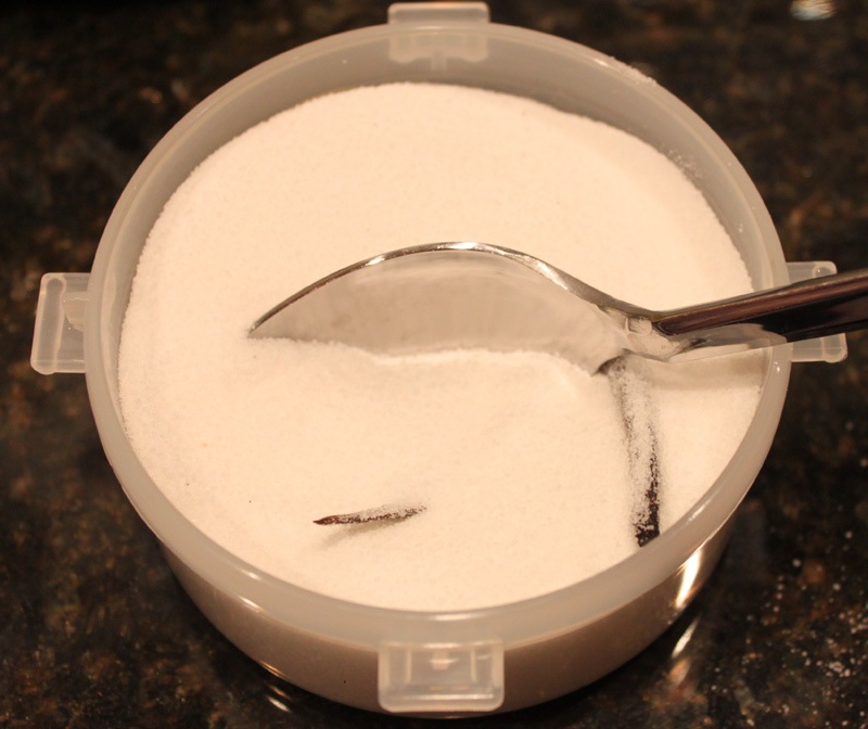 When the container is full let it sit for 5-10 minutes. Then mash the pods around in the sugar with a spoon or fork to release the oils. Lock the lid on and store in a cool, dry place indefinitely (anywhere you keep your sugar regularly is good for storage). Shake occasionally (every few days or so) as the sugar can clump up.