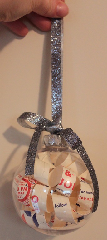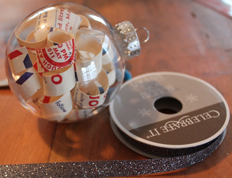 Carefully stuff each curled strip into the ornament (I got mine at Michael’s, by the way). I used my pencil to push them down in there.