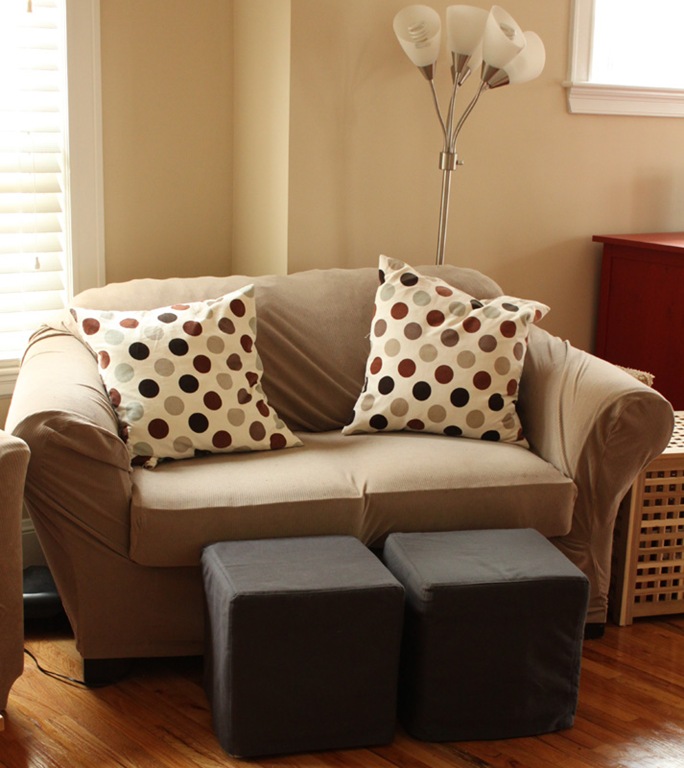 When we first moved into our house and bought our loveseat something just wasn’t quite right. It’s brand new so the cushions are super firm, it’s also deep so you have to sit allll the way back with your feet dangling off the edge. My solution: kick back with a foot rest. So we bought a pair of cubed ottomans from IKEA. The drab gray cover left something to be desired so I set out to make new ones (I do love a sewing project).