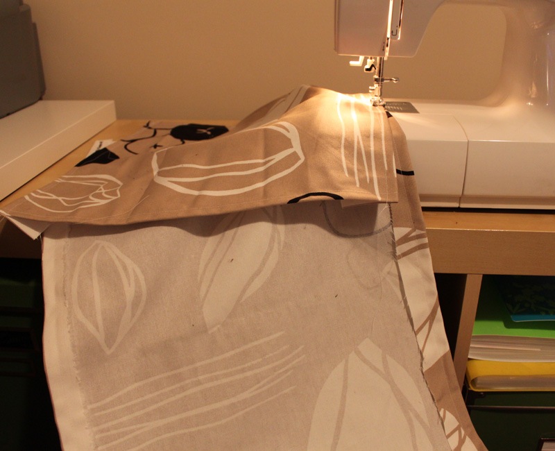 I bought some fabric at IKEA (the lovely Makjen) and got to work drawing up a pattern for the covers. Basically I needed a 15″ x 15″ square for the top and a 60″ x 15″ piece for the sides. I measured out the fabric, adding an extra inch on all sides for a hem allowance, and then cut it. You can see how they look below.