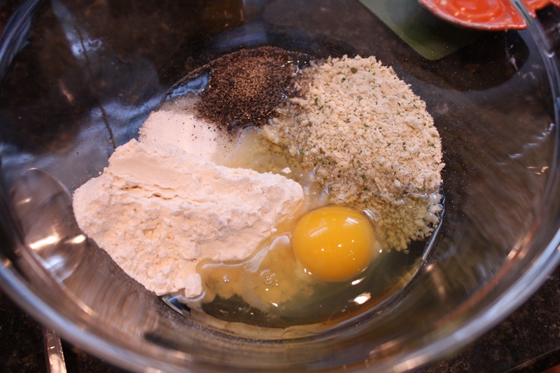 Next mix the flour, bread crumbs, egg, pepper, and salt together in a separate bowl. (A note: I like Italian bread crumbs because they come preseasoned but you could use plain or panko if you like.) Add your grated potatoes to the mixture and combine thoroughly.