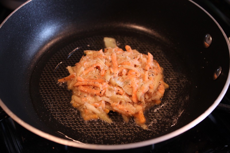 In a large saute pan heat 1/4 cup of canola oil over medium heat. When it starts sizzle drop in your latke(s). Each latke should be roughly about 2 tbsp. of your batter formed into a little patty. Fry in the oil until the edges brown then flip. You can press the latkes down slightly to help form your patty. Thin latkes are better than thick ones, they crisp better and cook more uniformly through the middle. You can cook them individually (shown) or 4-5 at a time in a bigger saute pan (which I recommend).