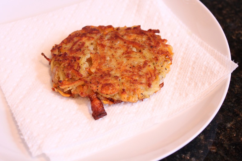 When you remove the cooked latkes put them on a paper towel lined plate to wick away the excess oil. As you cook your batch keep track of the oil level, if it gets too low just add a little more. You don’t want to add so much oil that they get soggy, just enough to immerse the bottom and crisp them. You’re looking for about 1/4-1/2 inch of oil in the bottom of the pan at all times.