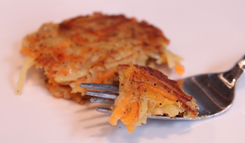 These latkes are savory and hearty, but very light. The two potatoes compliment each other perfectly and the hint of onion brings it all together. Serve hot as is or topped with greek yogurt!