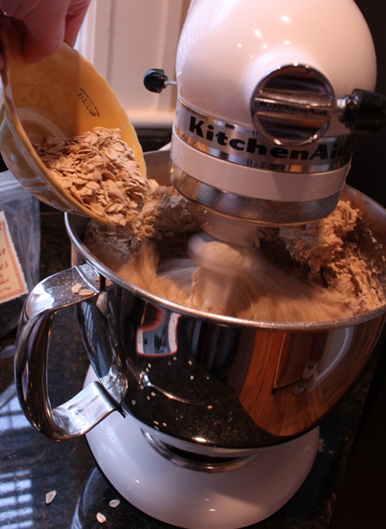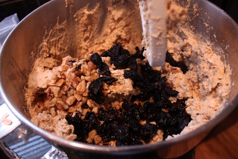 Next, slowly incorporate the dry ingredients (baking powder, cinnamon, flour, oatmeal, etc). When all of the wet and dry ingredients are mixed together, add in the walnuts and cherries.