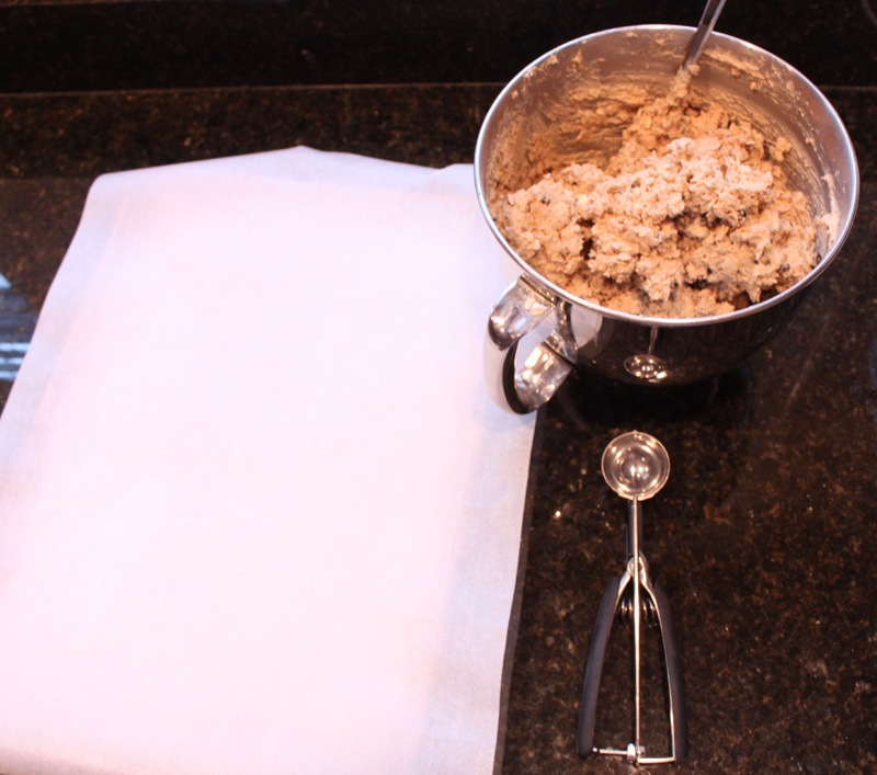 Scoop uniform dough balls (I use a #20 disher for cookies) onto a parchment paper lined cookie sheet.