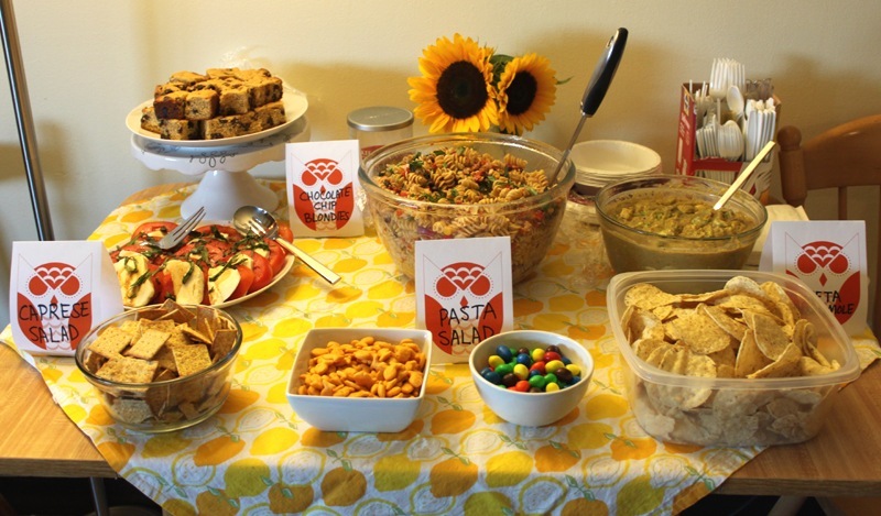 1. Buffalo tofu bites with vegan ranch dressing, veggies, chips, dips, a cheese plate, peanut butter and jelly cookies….and then of course, the delicious offerings of our friends. :)