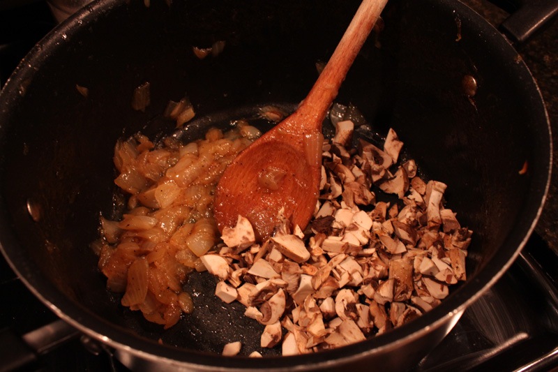 I pre-caramelized a huge batch of onions for the week so I made my filling in the same pot. I highly recommend doing this, so much flavor! In your pot combine onions, mushrooms, garlic, chicken stock, and salt and pepper. Cook for 7-10 minutes over medium heat or until the mushrooms have softened.