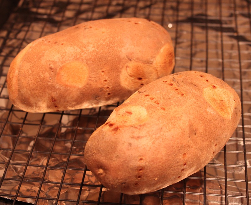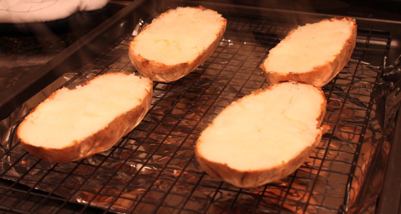 When they are done take the potatoes out of the oven, cut them in half, and let them cool for 20-30 minutes.