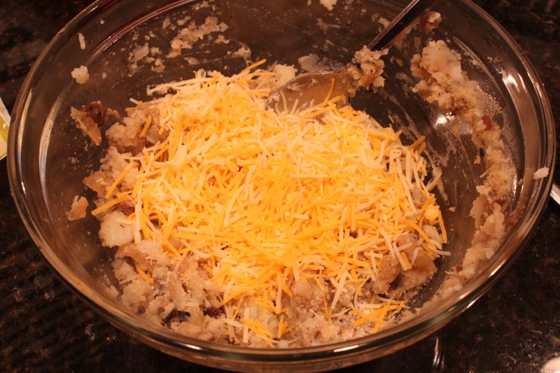 Add your cooked filling to the bowl with the potatoes. Add half the cheese and mix thoroughly.
