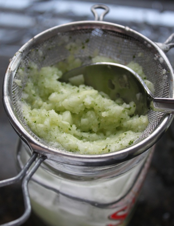 Make sure to press all of the water out of the cucumber pulp with a spoon. Don’t throw away the pulp! You’ll see why below.